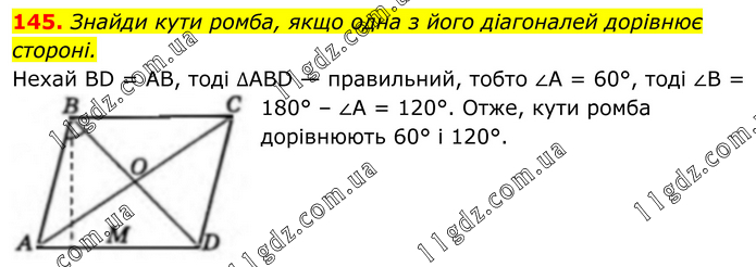 145. Знайди кути ромба, якщо одна з його діагоналей дорівнює стороні. Нехай BD = AВ, тоді ∆ABD — правильний, тобто ∠A = 60°, тоді ∠B = 180° – ∠A = 120°. Отже, кути ромба дорівнюють 60° і 120°.