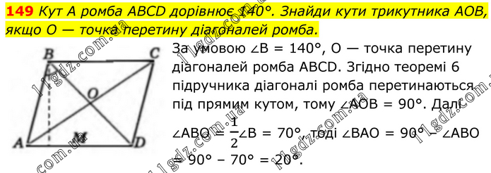 149 Кут A ромба ABCD дорівнює 140°. Знайди кути трикутника AOB, якщо O — точка перетину діагоналей ромба. За умовою ∠B = 140°, О — точка перетину діагоналей ромба ABCD. Згідно теоремі 6 підручника діагоналі ромба перетинаються під прямим кутом, тому ∠AOB = 90°. Далі ∠ABO = 1/2∠B = 70°, тоді ∠BAO = 90° – ∠ABO = 90° – 70° = 20°.