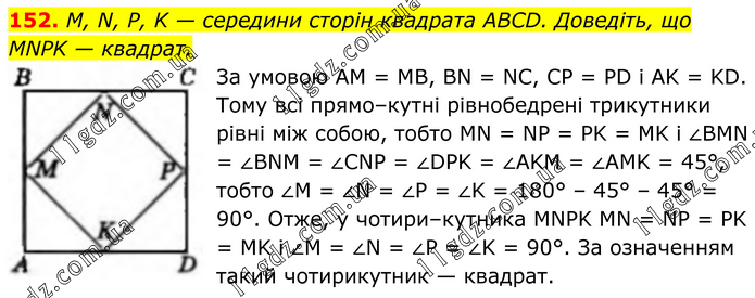 152. M, N, P, K — середини сторін квадрата ABCD. Доведіть, що MNPK — квадрат. За умовою AM = MB, BN = NC, CP = PD і AK = KD. Тому всі прямо–кутні рівнобедрені трикутники рівні між собою, тобто MN = NP = PK = MK і ∠BMN = ∠BNM = ∠CNP = ∠DPK = ∠AKM = ∠AMK = 45°, тобто ∠M = ∠N = ∠P = ∠K = 180° – 45° – 45° = 90°. Отже, у чотири–кутника MNPK MN = NP = PK = MK і ∠M = ∠N = ∠P = ∠K = 90°. За означенням такий чотирикутник — квадрат.