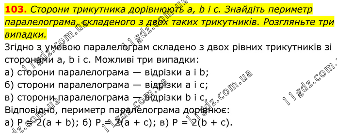 103. Сторони трикутника дорівнюють a, b і c. Знайдіть периметр паралелограма, складеного з двох таких трикутників. Розгляньте три випадки. Згідно з умовою паралелограм складено з двох рівних трикутників зі сторонами а, b і с. Можливі три випадки: а) сторони паралелограма — відрізки а і b; б) сторони паралелограма — відрізки а і с; в) сторони паралелограма — відрізки b і с. Відповідно, периметр паралелограма дорівнює: a) P = 2(а + b); б) P = 2(а + c); в) P = 2(b + с).