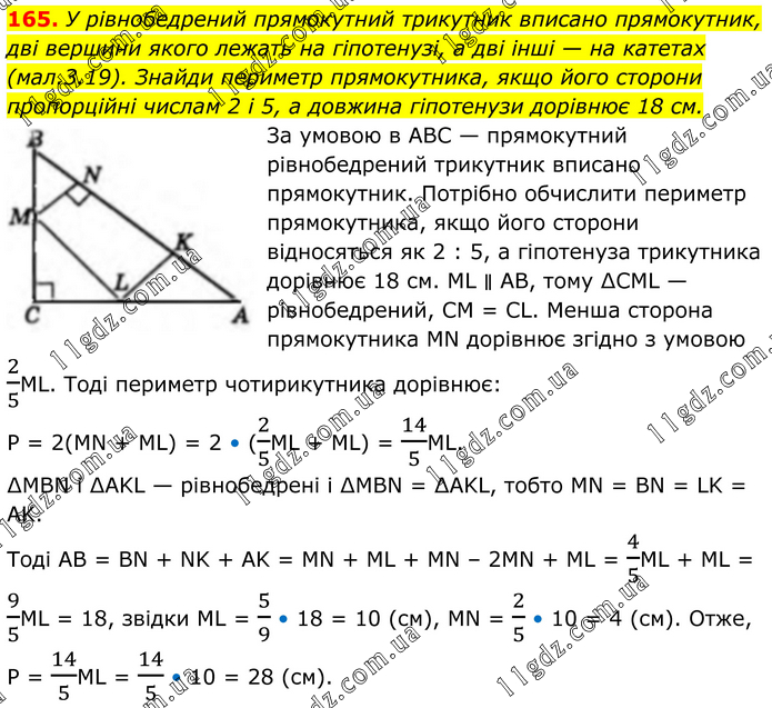 165. У рівнобедрений прямокутний трикутник вписано прямокутник, дві вершини якого лежать на гіпотенузі, а дві інші — на катетах (мал.3.19). Знайди периметр прямокутника, якщо його сторони пропорційні числам 2 і 5, а довжина гіпотенузи дорівнює 18 см. За умовою в ABC — прямокутний рівнобедрений трикутник вписано прямокутник. Потрібно обчислити периметр прямокутника, якщо його сторони відносяться як 2 : 5, а гіпотенуза трикутника дорівнює 18 см. ML ∥ AВ, тому ∆CML — рівнобедрений, CM = CL. Менша сторона прямокутника MN дорівнює згідно з умовою 2/5ML. Тоді периметр чотирикутника дорівнює: P = 2(MN + ML) = 2 • (2/5ML + ML) = 14/5ML. ∆MBN і ∆AKL — рівнобедрені і ∆MBN = ∆AKL, тобто MN = BN = LK = AK. Тоді AB = BN + NK + AK = MN + ML + MN – 2MN + ML = 4/5ML + ML = 9/5ML = 18, звідки ML = 5/9 • 18 = 10 (см), MN = 2/5 • 10 = 4 (см). Отже, P = 14/5ML = 14/5 • 10 = 28 (см).