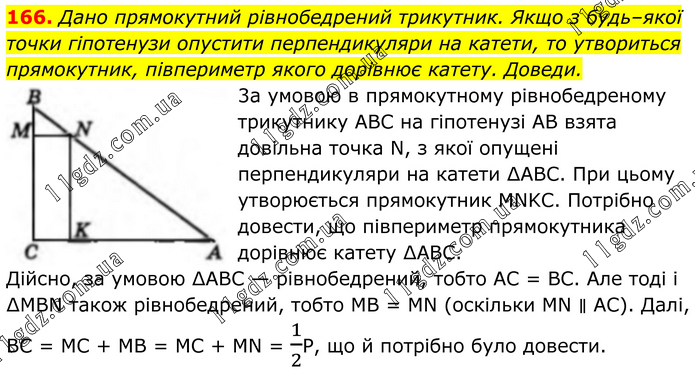 166. Дано прямокутний рівнобедрений трикутник. Якщо з будь–якої точки гіпотенузи опустити перпендикуляри на катети, то утвориться прямокутник, півпериметр якого дорівнює катету. Доведи. 3а умовою в прямокутному рівнобедреному трикутнику ABC на гіпотенузі AB взята довільна точка N, з якої опущені перпендикуляри на катети ∆ABC. При цьому утворюється прямокутник MNKC. Потрібно довести, що півпериметр прямокутника дорівнює катету ∆АВС. Дійсно, за умовою ∆ABC — рівнобедрений, тобто AC = BC. Але тоді і ∆MBN також рівнобедрений, тобто MB = MN (оскільки MN ∥ AC). Далі, BC = MC + MB = MC + MN = 1/2Р, що й потрібно було довести.