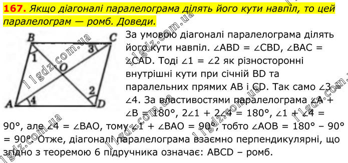 167. Якщо діагоналі паралелограма ділять його кути навпіл, то цей паралелограм — ромб. Доведи. За умовою діагоналі паралелограма ділять його кути навпіл. ∠ABD = ∠CBD, ∠BAC = ∠CAD. Тоді ∠1 = ∠2 як різносторонні внутрішні кути при січній BD та паралельних прямих AB і CD. Так само ∠3 = ∠4. За властивостями паралелограма ∠A + ∠B = 180°, 2∠1 + 2∠4 = 180°, ∠1 + ∠4 = 90°, але ∠4 = ∠BAO, тому ∠1 + ∠BAO = 90°, тобто ∠AOB = 180° – 90° = 90°. Отже, діагоналі паралелограма взаємно перпендикулярні, що згідно з теоремою 6 підручника означає: ABCD – ромб.
