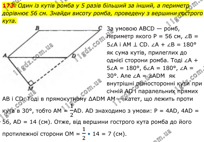 173. Один із кутів ромба у 5 разів більший за інший, а периметр дорівнює 56 см. Знайди висоту ромба, проведену з вершини гострого кута. 3а умовою ABCD — ромб, периметр якого P = 56 см, ∠B = 5∠A і AM ⊥ CD. ∠A + ∠B = 180° як сума кутів, прилеглих до однієї сторони ромба. Тоді ∠A + 5∠A = 180°, 6∠A = 180°, ∠A = 30°. Але ∠A = ∠ADM як внутрішні різносторонні кути при січній AD і паралельних прямих AB і CD. Тоді в прямокутному ∆ADM AM — катет, що лежить проти кута в 30°, тобто AM = 1/2AD. AD знаходимо з умови: P = 4AD, 4AD = 56, AD = 14 (см). Отже, від вершини гострого кута ромба до його протилежної сторони OM = 1/2 • 14 = 7 (см).