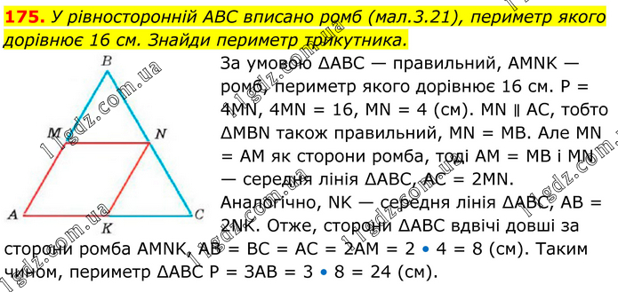 175. У рівносторонній ABC вписано ромб (мал.3.21), периметр якого дорівнює 16 см. Знайди периметр трикутника. За умовою ∆АВС — правильний, AMNK — ромб, периметр якого дорівнює 16 см. P = 4MN, 4MN = 16, MN = 4 (см). MN ∥ AC, тобто ∆MBN також правильний, MN = MB. Але MN = AM як сторони ромба, тоді AM = MB і MN — середня лінія ∆ABC, AC = 2MN. Аналогічно, NK — середня лінія ∆АВС, AB = 2NK. Отже, сторони ∆ABC вдвічі довші за сторони ромба AMNK, AB = BC = AC = 2АМ = 2 • 4 = 8 (см). Таким чином, периметр ∆ABC P = ЗАВ = 3 • 8 = 24 (см).