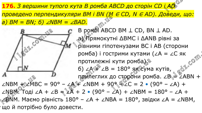 176. З вершини тупого кута B ромба ABCD до сторін CD і AD проведено перпендикуляри BM і BN (M ∈ CD, N ∈ AD). Доведи, що: а) BM = BN; б) ∠NBM = ∠BAD. В ромбі ABCD BM ⊥ CD, BN ⊥ AD. а) Прямокутні ∆BMC і ∆ANB рівні за рівними гіпотенузами BC і AB (сторони ромба) і гострими кутами (∠А = ∠C як протилежні кути ромба). б) ∠A + ∠B = 180° як сума кутів, прилеглих до сторони ромба. ∠B = ∠ABN + ∠NBM + ∠MBC = 90° – ∠A + ∠NBM + 90° – ∠C = 2 • (90° – ∠A) + ∠NBM. Тоді ∠A + ∠B = ∠A + 2 • (90° – ∠A) + ∠NBM = 180° – ∠A + ∠BNM. Маємо рівність 180° – ∠A + ∠NBA = 180°, звідки ∠A = ∠NBM, що й потрібно було довести.