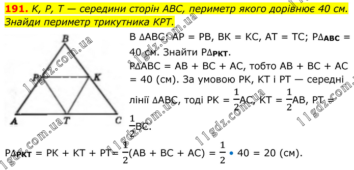 191. K, P, T — середини сторін ABC, периметр якого дорівнює 40 см. Знайди периметр трикутника KPT. В ∆АВС: AP = PB, BК = KC, AT = TC; P∆АВС = 40 см. Знайти P∆PKT. P∆ABC = AB + BC + AC, тобто AB + BC + AC = 40 (см). За умовою PK, KT і PT — середні лінії ∆АВС, тоді PK = 1/2АС, KТ = 1/2АВ, PT = 1/2ВС. P∆PKT = РК + KT + PT= 1/2(АВ + BC + AC) = 1/2 • 40 = 20 (см).