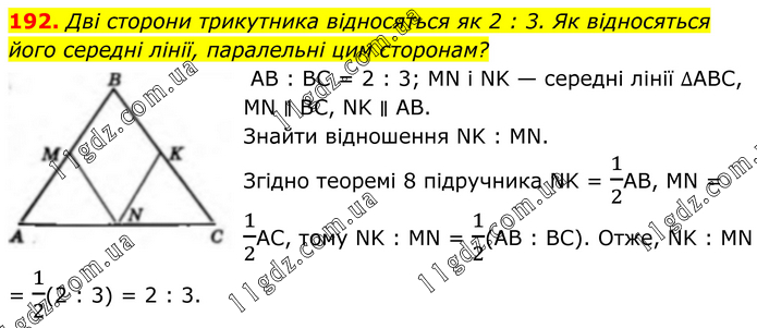192. Дві сторони трикутника відносяться як 2 : 3. Як відносяться його середні лінії, паралельні цим сторонам? AB : BC = 2 : 3; MN і NK — середні лінії ∆АВС, MN ∥ BC, NK ∥ AB. Знайти відношення NK : MN. Згідно теоремі 8 підручника NK = 1/2АВ, MN = 1/2АС, тому NK : MN = 1/2(AB : BC). Отже, NK : MN = 1/2(2 : 3) = 2 : 3.