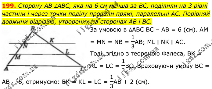 199. Сторону AB ∆ABC, яка на 6 см менша за BC, поділили на 3 рівні частини і через точки поділу провели прямі, паралельні AC. Порівняй довжини відрізків, утворених на сторонах AB і BC. За умовою в ∆АВС BC – AB = 6 (см). AM = MN = NB = 1/3АВ; ML ∥ NK ∥ AC. Тоді, згідно з теоремою Фалеса, BK = KL = LC = 1/3ВС. Враховуючи умову BC = AB + 6, отримуємо: BK = KL = LC = 1/3АВ + 2 (см).