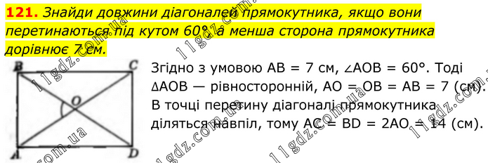 121. Знайди довжини діагоналей прямокутника, якщо вони перетинаються під кутом 60°, а менша сторона прямокутника дорівнює 7 см. Згідно з умовою AB = 7 см, ∠AOB = 60°. Тоді ∆AOB — рівносторонній, AO = OB = AB = 7 (см). В точці перетину діагоналі прямокутника діляться навпіл, тому AC = BD = 2AO = 14 (см).