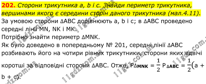 202. Сторони трикутника a, b і c. Знайди периметр трикутника, вершинами якого є середини сторін даного трикутника (мал.4.11). За умовою сторони ∆АВС дорівнюють а, b і с; в ∆ABC проведено середні лінії MN, NK і MK. Потрібно знайти периметр ∆MNK. Як було доведено в попередньому № 201, середні лінії ∆АВС розбивають його на чотири рівних трикутники, сторони яких вдвічі коротші за відповідні сторони ∆АВС. Отже, P∆MNK = 1/2 P ∆ABC = 1/2(a + b + c).