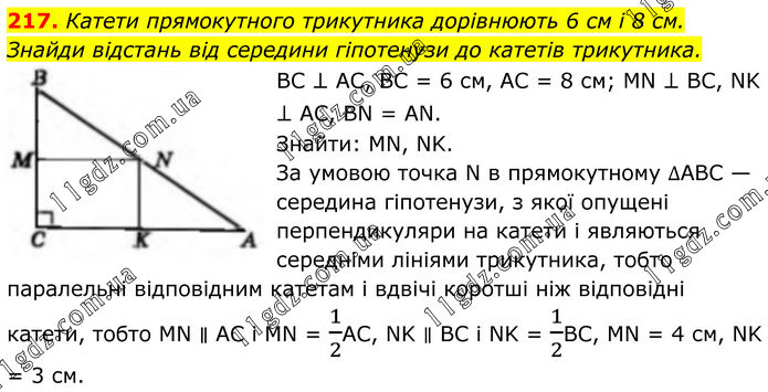 217. Катети прямокутного трикутника дорівнюють 6 см і 8 см. Знайди відстань від середини гіпотенузи до катетів трикутника. BC ⊥ AC, BC = 6 см, AC = 8 см; MN ⊥ BC, NK ⊥ AC, BN = AN. Знайти: MN, NK. За умовою точка N в прямокутному ∆АBC — середина гіпотенузи, з якої опущені перпендикуляри на катети і являються середніми лініями трикутника, тобто паралельні відповідним катетам і вдвічі коротші ніж відповідні катети, тобто MN ∥ AC і MN = 1/2АС, NK ∥ BC і NK = 1/2ВС, MN = 4 см, NK = 3 см.