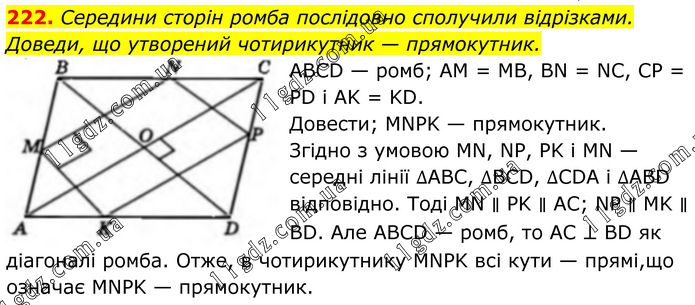 222. Середини сторін ромба послідовно сполучили відрізками. Доведи, що утворений чотирикутник — прямокутник. ABCD — ромб; AM = MB, BN = NC, CP = PD i AK = KD. Довести; MNPK — прямокутник. Згідно з умовою MN, NP, PK і MN — середні лінії ∆АВС, ∆BCD, ∆CDA і ∆ABD відповідно. Тоді MN ∥ PK ∥ AC; NP ∥ MK ∥ BD. Але ABCD — ромб, то AC ⊥ BD як діагоналі ромба. Отже, в чотирикутнику MNPK всі кути — прямі,що означає MNPK — прямокутник.