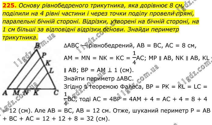225. Основу рівнобедреного трикутника, яка дорівнює 8 см, поділили на 4 рівні частини і через точки поділу провели прямі, паралельні бічній стороні. Відрізки, утворені на бічній стороні, на 1 см більші за відповідні відрізки основи. Знайди периметр трикутника. ∆ABC — рівнобедрений, AB = BC, AC = 8 см, AM = MN = NK = KC = 1/4АС; MP ∥ AB, NK ∥ AB, KL ∥ AB; BP = AM ⊥ 1 (см). Знайти периметр ∆ABC. Згідно з теоремою Фалеса, BP = PK = KL = LC = 1/4ВС, тоді AC = 4BP = 4AM + 4 = AC + 4 = 8 + 4 = 12 (см). Але AB = BC, AB = 12 см. Отже, шуканий периметр Р = АВ + ВС + АС = 12 + 12 + 8 = 32 (см).