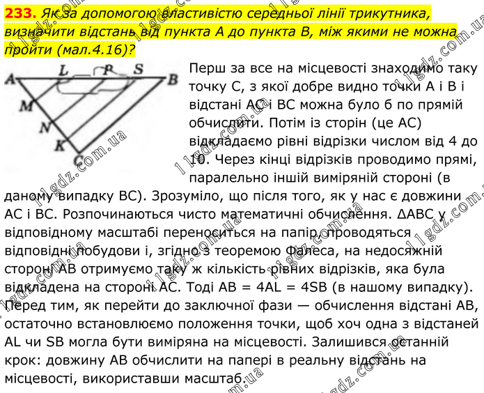233. Як за допомогою властивістю середньої лінії трикутника, визначити відстань від пункта A до пункта B, між якими не можна пройти (мал.4.16)? Перш за все на місцевості знаходимо таку точку С, з якої добре видно точки А і В і відстані AC і BC можна було б по прямій обчислити. Потім із сторін (це AC) відкладаємо рівні відрізки числом від 4 до 10. Через кінці відрізків проводимо прямі, паралельно іншій виміряній стороні (в даному випадку BC). Зрозуміло, що після того, як у нас є довжини AC і BC. Розпочинаються чисто математичні обчислення. ∆ABC у відповідному масштабі переноситься на папір, проводяться відповідні побудови і, згідно з теоремою Фалеса, на недосяжній стороні AB отримуємо таку ж кількість рівних відрізків, яка була відкладена на стороні AC. Тоді AB = 4AL = 4SB (в нашому випадку). Перед тим, як перейти до заключної фази — обчислення відстані AB, остаточно встановлюємо положення точки, щоб хоч одна з відстаней AL чи SB могла бути виміряна на місцевості. Залишився останній крок: довжину AB обчислити на папері в реальну відстань на місцевості, використавши масштаб.