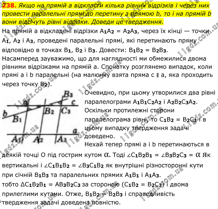 238. Якщо на прямій a відкласти кілька рівних відрізків і через них провести паралельні прямі до перетину з прямою b, то і на прямій b вони відсічуть рівні відрізки. Доведи це твердження. На прямій а відкладені відрізки A1A2 = A2A3, через їх кінці — точки A1, A2 і A3, проведені паралельні прямі, які перетинають пряму відповідно в точках B1, B2 і B3. Довести: B1B2 = B2B3. Насамперед зауважимо, що для наглядності ми обмежилися двома рівними відрізками на прямій а. Спочатку розглянемо випадок, коли прямі а і b паралельні (на малюнку взята пряма с ∥ а, яка проходить через точку B2). Очевидно, при цьому утворилися два рівні паралелограми A1B1C2A2 і A2B2C3A2. Оскільки протилежні сторони паралелограма рівні, то C1B2 = B2C1 і в цьому випадку твердження задачі доведено. Нехай тепер прямі а і b перетинаються в деякій точці O під гострим кутом α. Тоді ∠C1B2B1 = ∠B3B2C3 = α як вертикальні і ∠C1B1B2 = ∠B3C1B2 як внутрішні різносторонні кути при січній B1B3 та паралельних прямих A1B1 і A1A3. тобто ∆C1B2B1 = AB3B2C3 за стороною (C1B2 = B2C3) і двома прилеглими кутами. Отже, B1B2 = B2B3 і справедливість твердження задачі доведена повністю.