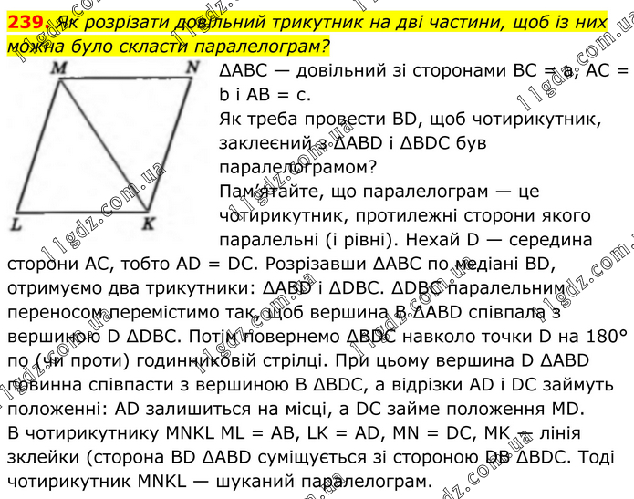 239. Як розрізати довільний трикутник на дві частини, щоб із них можна було скласти паралелограм? ∆ABC — довільний зі сторонами BC = а, AC = b і AB = с. Як треба провести BD, щоб чотирикутник, заклеєний з ∆ABD і ∆BDC був паралелограмом? Пам’ятайте, що паралелограм — це чотирикутник, протилежні сторони якого паралельні (і рівні). Нехай D — середина сторони AC, тобто AD = DC. Розрізавши ∆ABC по медіані BD, отримуємо два трикутники: ∆ABD і ∆DBC. ∆DBC паралельним переносом перемістимо так, щоб вершина В ∆ABD співпала з вершиною D ∆DBC. Потім повернемо ∆BDC навколо точки D на 180° по (чи проти) годинниковій стрілці. При цьому вершина D ∆ABD повинна співпасти з вершиною B ∆BDC, а відрізки AD і DC займуть положенні: AD залишиться на місці, a DC займе положення MD. В чотирикутнику MNKL ML = AB, LK = AD, MN = DC, MK — лінія зклейки (сторона BD ∆ABD суміщується зі стороною DB ∆BDC. Тоді чотирикутник MNKL — шуканий паралелограм.