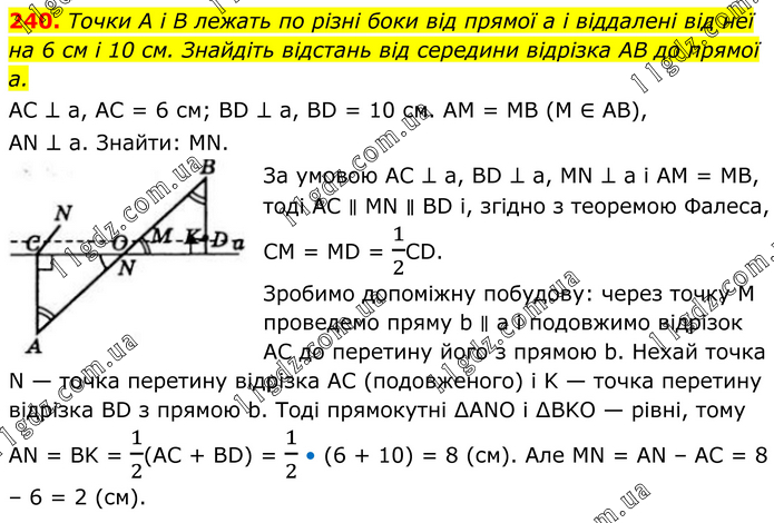 240. Точки A і B лежать по різні боки від прямої a і віддалені від неї на 6 см і 10 см. Знайдіть відстань від середини відрізка AB до прямої a. AC ⊥ а, AC = 6 см; BD ⊥ a, BD = 10 см. AM = MB (М ∈ AB), AN ⊥ а. Знайти: MN. За умовою AC ⊥ a, BD ⊥ а, МN ⊥ a i AM = MB, тоді AC ∥ MN ∥ BD і, згідно з теоремою Фалеса, CM = MD = 1/2CD. Зробимо допоміжну побудову: через точку M проведемо пряму b ∥ a і подовжимо відрізок AC до перетину його з прямою b. Нехай точка N — точка перетину відрізка AC (подовженого) і K — точка перетину відрізка BD з прямою b. Тоді прямокутні ∆ANO і ∆BKO — рівні, тому AN = BK = 1/2(AC + BD) = 1/2 • (6 + 10) = 8 (см). Але MN = AN – AC = 8 – 6 = 2 (см).