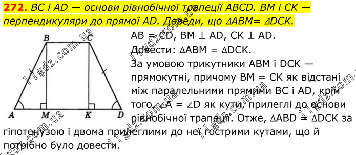 272. BC і AD — основи рівнобічної трапеції ABCD. BM і CK — перпендикуляри до прямої AD. Доведи, що ∆ABM= ∆DCK. AB = CD, BM ⊥ AD, CK ⊥ AD. Довести: ∆ABM = ∆DCK. За умовою трикутники ABM і DCK — прямокутні, причому BM = CK як відстані між паралельними прямими BC і AD, крім того, ∠A = ∠D як кути, прилеглі до основи рівнобічної трапеції. Отже, ∆ABD = ∆DCK за гіпотенузою і двома прилеглими до неї гострими кутами, що й потрібно було довести.