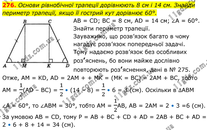276. Основи рівнобічної трапеції дорівнюють 8 см і 14 см. Знайди периметр трапеції, якщо її гострий кут дорівнює 60°. AB = CD; BC = 8 см, AD = 14 см; ∠A = 60°. Знайти периметр трапеції. Зауважимо, що розв’язок багато в чому нагадує розв’язок попередньої задачі. Тому надаємо розв’язок без особливих роз’яснень, бо вони майже дослівно повторюють роз’яснення, дані в № 275. Отже, AM = KD, AD = 2AM + + MK = (MK = BC) = 2AM + BC, тобто AM = 1/2(АD – BC) = 1/2 • (14 – 8) = 1/2 • 6 = З (см). Оскільки в ∆ABM ∠A = 60°, то ∠ABM = 30°, тобто AM = 1/2АВ, AB = 2AM = 2 • 3 =6 (см). За умовою AB = CD, тому P = AB + BC + CD + AD = 2АВ + BC + AD = 2 • 6 + 8 + 14 = 34 (см).