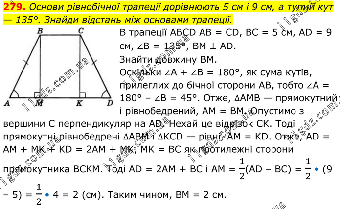 279. Основи рівнобічної трапеції дорівнюють 5 см і 9 см, а тупий кут — 135°. Знайди відстань між основами трапеції. В трапеції ABCD AB = CD, BC = 5 см, AD = 9 см, ∠B = 135°, BM ⊥ AD. Знайти довжину BM. Оскільки ∠A + ∠B = 180°, як сума кутів, прилеглих до бічної сторони AВ, тобто ∠A = 180° – ∠B = 45°. Отже, ∆AMB — прямокутний і рівнобедрений, AM = BM. Опустимо з вершини C перпендикуляр на AD. Нехай це відрізок CK. Тоді прямокутні рівнобедрені ∆АВМ і ∆KCD — рівні, AM = KD. Отже, AD = AM + MK + KD = 2AM + MK, MK = BC як протилежні сторони прямокутника ВСКМ. Тоді AD = 2AM + BC і AM = 1/2(АD – BC) = 1/2 • (9 – 5) = 1/2 • 4 = 2 (см). Таким чином, BM = 2 см.