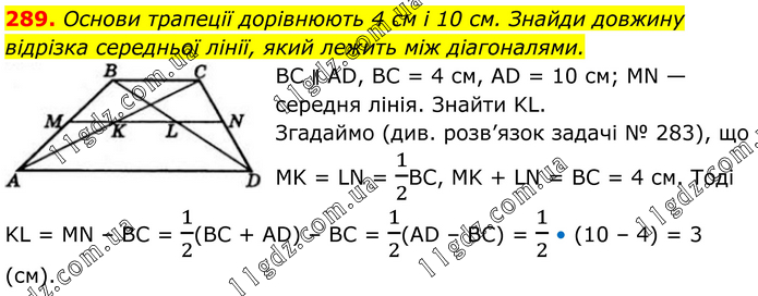 289. Основи трапеції дорівнюють 4 см і 10 см. Знайди довжину відрізка середньої лінії, який лежить між діагоналями. BC ∥ AD, BC = 4 см, AD = 10 см; MN — середня лінія. Знайти KL. Згадаймо (див. розв’язок задачі № 283), що MK = LN = 1/2BС, MK + LN = BC = 4 см. Тоді KL = MN – BC = 1/2(ВС + AD) – BC = 1/2(AD – BC) = 1/2 • (10 – 4) = 3 (см).