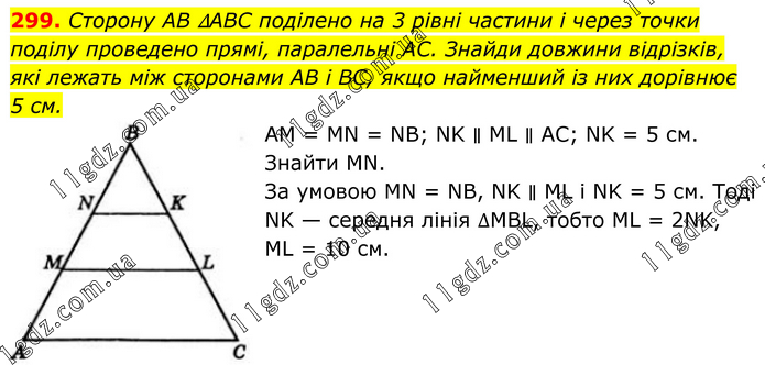 299. Сторону AB ∆ABC поділено на 3 рівні частини і через точки поділу проведено прямі, паралельні AC. Знайди довжини відрізків, які лежать між сторонами AB і BC, якщо найменший із них дорівнює 5 см. AM = MN = NB; NK ∥ ML ∥ AC; NK = 5 см. Знайти MN. За умовою MN = NB, NK ∥ ML і NK = 5 см. Тоді NK — середня лінія ∆MBL, тобто ML = 2NK, ML = 10 см.