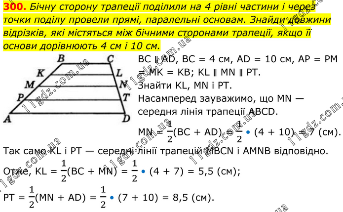300. Бічну сторону трапеції поділили на 4 рівні частини і через точки поділу провели прямі, паралельні основам. Знайди довжини відрізків, які містяться між бічними сторонами трапеції, якщо її основи дорівнюють 4 см і 10 см. BC ∥ AD, BC = 4 см, AD = 10 см, AP = PM = MK = KB; KL ∥ MN ∥ PT. Знайти KL, MN і PT. Насамперед зауважимо, що MN — середня лінія трапеції ABCD. MN = 1/2(BC + AD) = 1/2 • (4 + 10) = 7 (см). Так само KL і PT — середні лінії трапецій MBCN і AMNB відповідно. Отже, KL = 1/2(ВС + МN) = 1/2 • (4 + 7) = 5,5 (см); PT = 1/2(MN + AD) = 1/2 • (7 + 10) = 8,5 (см).