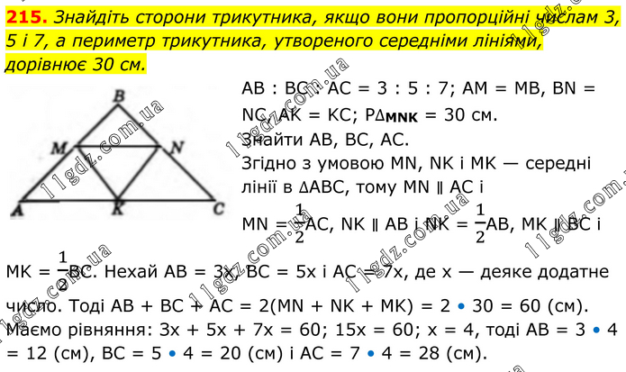 215. Знайдіть сторони трикутника, якщо вони пропорційні числам 3, 5 і 7, а периметр трикутника, утвореного середніми лініями, дорівнює 30 см. AB : BC : AC = 3 : 5 : 7; AM = MB, BN = NC, AK = KC; P∆MNK = 30 см. Знайти AB, BC, AC. Згідно з умовою MN, NK і MK — середні лінії в ∆ABC, тому MN ∥ AC і MN = 1/2АС, NK ∥ AB і NK = 1/2АВ, MK ∥ BC і MK = 1/2ВС. Нехай AB = 3x, BC = 5x і AC = 7х, де х — деяке додатне число. Тоді AB + BC + AC = 2(MN + NK + MK) = 2 • 30 = 60 (см). Маємо рівняння: Зх + 5х + 7x = 60; 15х = 60; х = 4, тоді AB = 3 • 4 = 12 (см), BC = 5 • 4 = 20 (см) і AC = 7 • 4 = 28 (см).