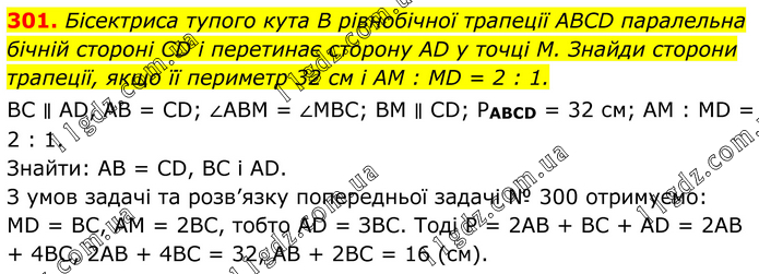 301. Бісектриса тупого кута B рівнобічної трапеції ABCD паралельна бічній стороні CD і перетинає сторону AD у точці M. Знайди сторони трапеції, якщо її периметр 32 см і AM : MD = 2 : 1. BC ∥ AD, AB = CD; ∠ABM = ∠MBC; BM ∥ CD; PABCD = 32 см; AM : MD = 2 : 1. Знайти: AB = CD, BC і AD. З умов задачі та розв’язку попередньої задачі № 300 отримуємо: MD = BC, AM = 2BC, тобто AD = ЗВС. Тоді P = 2АВ + BC + AD = 2АВ + 4ВС, 2АВ + 4ВС = 32, AB + 2BC = 16 (см).