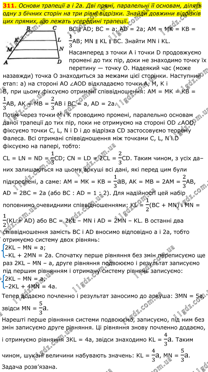 311. Основи трапеції a і 2a. Дві прямі, паралельні її основам, ділять одну з бічних сторін на три рівні відрізки. Знайди довжини відрізків цих прямих, що лежать усередині трапеції. BC ∥ AD; BC = a; AD = 2а; AM = MK = KB = 1/3AB; MN ∥ KL ∥ ВС. Знайти MN і KL. Насамперед з точки А і точки D продовжуємо промені до тих пір, доки не знаходимо точку їх перетину — точку О. Надеякий час (може назавжди) точка O знаходиться за межами цієї сторінки. Наступний етап: а) на стороні AO ∠AOD відкладаємо точки А, М, K і B, при цьому фіксуємо отримані співвідношення: AM = MK = KB = 1/3AB, AK = MB = 2/3AB і BC = a, AD = 2а. Потім через точки M і K проводимо промені, паралельно основам даної трапеції до тих пір, поки не отримуємо на стороні OD ∠AOD, фіксуємо точки C, L, N і D і до відрізка CD застосовуємо теорему Фалеса. Всі отримані співвідношення між точками С, L, N і D фіксуємо на папері, тобто: CL = LN = ND = 1/3СD; CN = LD = 2CL = 2/3СD. Таким чином, з усіх да– них залишаються на цьому аркуші всі дані, які перед цим були підкреслені, а саме: AM = MK = КВ = 1/3аВ, AK = MB = 2AM = 2/3AB, AD = 2BC = 2а (або BC : AD = 1 : 2). Для надійності цей набір поповнимо очевидними співвідношеннями: KL = 1/2(BC + MN) і MN = 1/2(KL + AD) або BC = 2KL – MN і AD = 2MN – KL. В останні два співвідношення замість BC і AD вносимо відповідно а і 2а, тобто отримуємо систему двох рівнянь: 2KL – MN = а; –KL + 2MN = 2a. Спочатку перше рівняння без змін переписуємо ще раз 2KL – MN – а, друге рівняння подвоюємо і результат записуємо під першим рівнянням і отриману систему рівнянь записуємо: 2KL – MN = a; –2KL + 4MN = 4a. Тепер додаємо почленно і результат заносимо до аркуша: ЗMN = 5а, звідси MN = 5/3а. Нарешті перше рівняння системи подвоюємо, записуємо, під ним без змін записуємо друге рівняння. Ці рівняння знову почленно додаємо, і отримуємо рівняння 3KL = 4а, звідси знаходимо KL = 4/3a. Таким чином, шукані величини набувають значень: KL = 4/3а, MN = 5/3a. Задача розв’язана.