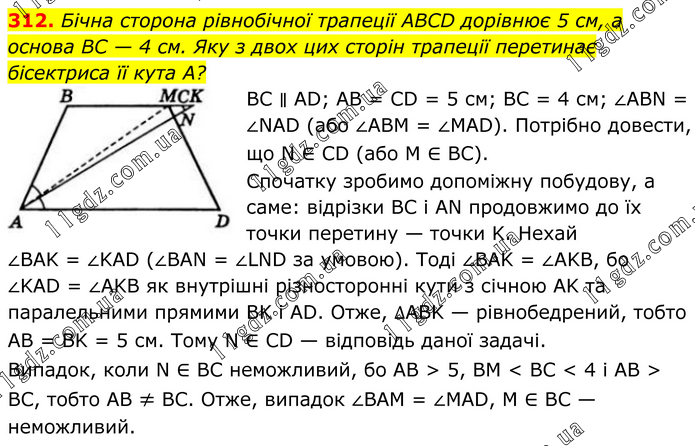 312. Бічна сторона рівнобічної трапеції ABCD дорівнює 5 см, а основа BC — 4 см. Яку з двох цих сторін трапеції перетинає бісектриса її кута A? BC ∥ AD; AB = CD = 5 см; BC = 4 см; ∠ABN = ∠NAD (або ∠ABM = ∠MAD). Потрібно довести, що N ∈ CD (або M ∈ BC). Спочатку зробимо допоміжну побудову, а саме: відрізки BC і AN продовжимо до їх точки перетину — точки K. Нехай ∠BAK = ∠KAD (∠BAN = ∠LND за умовою). Тоді ∠BAK = ∠AKB, бо ∠KAD = ∠AKB як внутрішні різносторонні кути з січною AK та паралельними прямими BK і AD. Отже, ∆ABK — рівнобедрений, тобто AB = BK = 5 см. Тому N ∈ CD — відповідь даної задачі. Випадок, коли N ∈ BC неможливий, бо AB > 5, BM < BC < 4 і AB > BC, тобто AB ≠ BC. Отже, випадок ∠BAM = ∠MAD, M ∈ BC — неможливий.