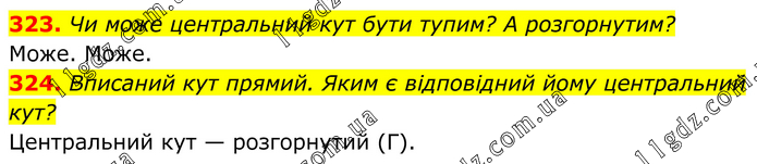 323. Чи може центральний кут бути тупим? А розгорнутим? Може. Може. 324. Вписаний кут прямий. Яким є відповідний йому центральний кут? Центральний кут — розгорнутий (Г).