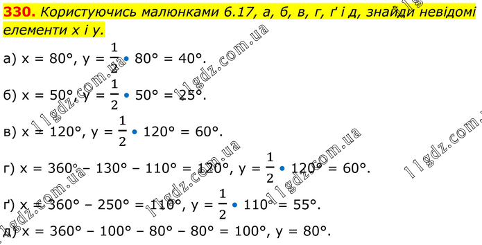 330. Користуючись малюнками 6.17, а, б, в, г, ґ і д, знайди невідомі елементи x і y. а) х = 80°, у = 1/2 • 80° = 40°. б) х = 50°, у = 1/2 • 50° = 25°. в) х = 120°, у = 1/2 • 120° = 60°. г) x = 360° – 130° – 110° = 120°, у = 1/2 • 120° = 60°. ґ) х = 360° – 250° = 110°, у = 1/2 • 110° = 55°. д) х = 360° – 100° – 80° – 80° = 100°, у = 80°.