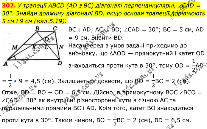 302. У трапеції ABCD (AD ∥ BC) діагоналі перпендикулярні, ∠CAD = 30°. Знайди довжину діагоналі BD, якщо основи трапеції дорівнюють 5 см і 9 см (мал.5.19). BC ∥ AD; AC ⊥ BD; ∠CAD = 30°; BC = 5 см, AD = 9 см. Знайти BD. Насамперед з умов задачі приходимо до висновку, що ∆AOD — прямокутний і катет OD знаходиться проти кута в 30°, тому OD = 1/2AD = 1/2 • 9 = 4,5 (см). Залишається довести, що BO = 1/2BC = 2 (см). Отже, BD = BO + OD = 6,5 см. Дійсно, в прямокутному BOC ∠BCO = ∠CAD = 30° як внутрішні різносторонні кути з січною AC та паралельними прямими BC і AD. Крім того, катет BO знаходиться проти кута в 30°. Таким чином, BO = 1/2BC = 2 (см), BD = 6,5 см.