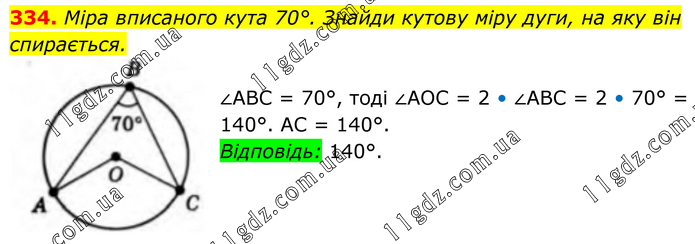 334. Міра вписаного кута 70°. Знайди кутову міру дуги, на яку він спирається. ∠ABC = 70°, тоді ∠AOC = 2 • ∠ABC = 2 • 70° = 140°. AC = 140°. Відповідь: 140°.