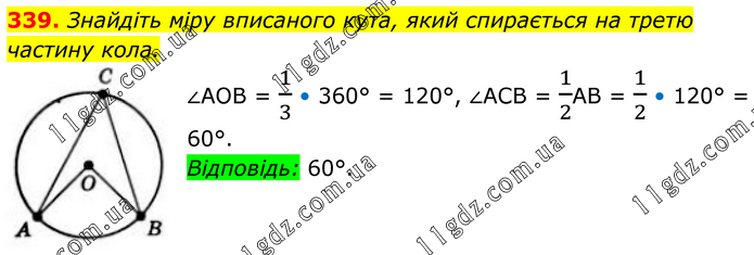 339. Знайдіть міру вписаного кута, який спирається на третю частину кола. ∠AOB = 1/3 • 360° = 120°, ∠ACB = 1/2АВ = 1/2 • 120° = 60°. Відповідь: 60°.