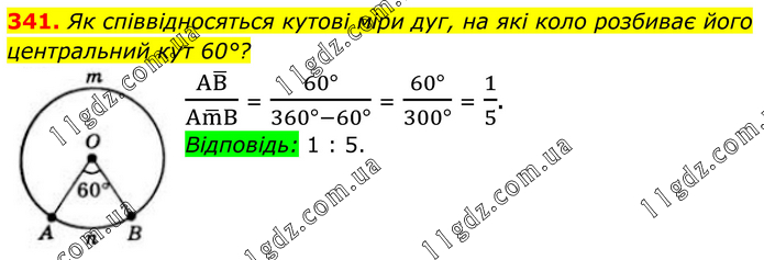 341. Як співвідносяться кутові міри дуг, на які коло розбиває його центральний кут 60°? (AB ̅)/(Am ̅B) = (60°)/(360°-60°) = (60°)/(300°) = 1/5. Відповідь: 1 : 5.