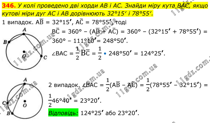 346. У колі проведено дві хорди AB і AC. Знайди міру кута BAC, якщо кутові міри дуг AC і AB дорівнюють 32°15′ і 78°55′. 1 випадок. AB ̅ = 32°15’, AС ̅ = 78°55’, тоді ВС ̅ = 360° – (АB ̅ + АС ̅) = 360° – (32°15’ + 78°55’) = 360° – 111°10’= 248°50’. ∠ВАС = 1/2 BC ̅ = 1/2 • 248°50’ = 124°25’. 2 випадок. ∠ВАС = 1/2(AB ̅ – АC ̅) = 1/2(78°55’ – 32°15’) = 1/246°40’ = 23°20’. Відповідь: 124°25’ або 23°20’.