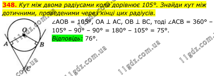 348. Кут між двома радіусами кола дорівнює 105°. Знайди кут між дотичними, проведеними через кінці цих радіусів. ∠AOB = 105°, OA ⊥ AC, OB ⊥ BC, тоді ∠ACB = 360° – 105° – 90° – 90° = 180° – 105° = 75°. Відповідь: 76°.