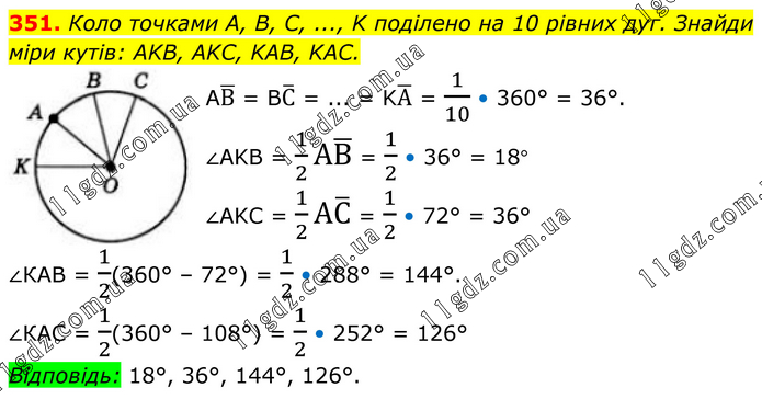 351. Коло точками A, B, C, ..., K поділено на 10 рівних дуг. Знайди міри кутів: AKB, AKC, KAB, KAC. AB ̅ = BC ̅ = ... = KA ̅ = 1/10 • 360° = 36°. ∠AKB = 1/2 AB ̅ = 1/2 • 36° = 18°. ∠AKC = 1/2 AC ̅ = 1/2 • 72° = 36°. ∠КАВ = 1/2(360° – 72°) = 1/2 • 288° = 144°. ∠КАС = 1/2(360° – 108°) = 1/2 • 252° = 126°. Відповідь: 18°, 36°, 144°, 126°.