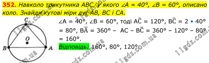 352. Навколо трикутника ABC, у якого ∠A = 40°, ∠B = 60°, описано коло. Знайди кутові міри дуг AB, BC і CA. ∠A = 40°, ∠B = 60°, тоді AC ̅ = 120°, BC ̅ = 2 • 40° = 80°, BA ̅ = 360° – AC – BC ̅ = 360° – 120° – 80° = 160°. Відповідь: 160°, 80°, 120°.