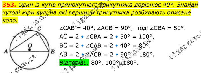353. Один із кутів прямокутного трикутника дорівнює 40°. Знайди кутові міри дуг, на які вершини трикутника розбивають описане коло. ∠CAB = 40°, ∠ACB = 90°, тоді ∠CBA = 50°. AC ̅ = 2 • ∠CBA = 2 • 50° = 100°, BC ̅ = 2 • ∠CAB = 2 • 40° = 80°, AВ ̅ = 2 • ∠ACB = 2 • 90° = 180°. Відповідь: 80°, 100°, 180°.