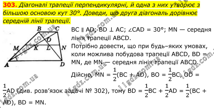 303. Діагоналі трапеції перпендикулярні, й одна з них утворює з більшою основою кут 30°. Доведи, що друга діагональ дорівнює середній лінії трапеції. BC ∥ AD; BD ⊥ AC; ∠CAD = 30°; MN — середня лінія трапеції ABCD. Потрібно довести, що при будь–яких умовах, коли можлива побудова трапеції ABCD, BD = MN, де MN — середня лінія трапеції ABCD. Дійсно, MN = 1/2(BC + AD), BO = 1/2BC, OD = 1/2AD (див. розв’язок задачі № 302), тому BD = 1/2BC + 1/2AD = 1/2(BC + AD), BD = MN.