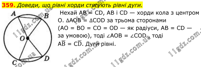 359. Доведи, що рівні хорди стягують рівні дуги. Нехай AB = CD, AB і CD — хорди кола з центром О. ∆AOB = ∆COD за трьома сторонами (AO = BO = CO = OD — як радіуси, AB = CD — за умовою), тоді ∠AOB = ∠COD , тоді AB ̅ = CD ̅. Дуги рівні.
