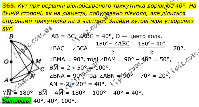 365. Кут при вершині рівнобедреного трикутника дорівнює 40°. На бічній стороні, як на діаметрі, побудовано півколо, яке ділиться сторонами трикутника на 3 частини. Знайди кутові міри утворених дуг. AB = BC, ∠ABC = 40°, O — центр кола. ∠ВАС = ∠BCA = (180°- ∠ABC)/2 = (180°- 40°)/2 = 70°. ∠BMA = 90°, тоді ∠ВАМ = 90° – 40° = 50°, BM ̅ = 2 • 50° = 100°. ∠BNA = 90°, тоді ∠ABN = 90° – 70° = 20°, AN ̅ = 2 • 20° = 40°. MN ̅ = 180°– BM ̅ – AM ̅ = 180° – 100° – 40° = 40°. Відповідь: 40°, 40°, 100°.