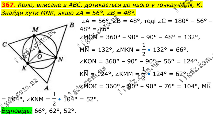 367. Коло, вписане в ABC, дотикається до нього у точках M, N, K. Знайди кути MNK, якщо ∠A = 56°, ∠B = 48°. ∠A = 56°, ∠B = 48°, тоді ∠C = 180° – 56° – 48° = 76° ∠MON = 360° – 90° – 90° – 48° = 132°, MN ̅ = 132°, ∠MKN = 1/2 • 132° = 66°. ∠KON = 360° – 90° – 90° – 56° = 124°, KN ̅ = 124°, ∠KMM = 1/2 • 124° = 62°. ∠МОК = 360° – 90° – 90° – 76° = 104°, МK ̅ = 104°, ∠KNM = 1/2 • 104° = 52°. Відповідь: 66°, 62°, 52°.