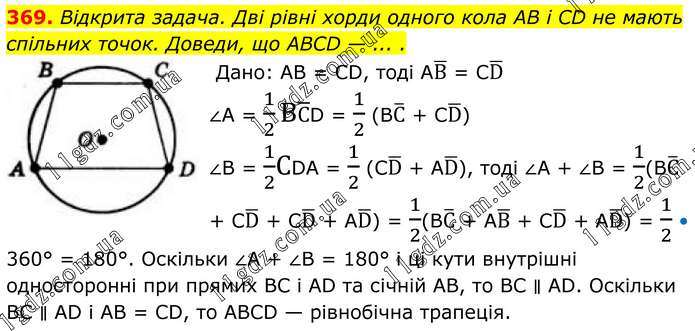 369. Відкрита задача. Дві рівні хорди одного кола AB і CD не мають спільних точок. Доведи, що ABCD — ... . Дано: AB = CD, тоді AB ̅ = CD ̅. ∠A = 1/2 BC ̅D = 1/2 (BC ̅ + CD ̅). ∠В = 1/2CDA = 1/2 (CD ̅ + AD ̅), тоді ∠A + ∠B = 1/2(BC ̅ + CD ̅ + CD ̅ + AD ̅) = 1/2(BC ̅ + AB ̅ + CD ̅ + AD ̅) = 1/2 • 360° = 180°. Оскільки ∠A + ∠В = 180° і ці кути внутрішні односторонні при прямих BC і AD та січній AB, то ВС ∥ АD. Оскільки ВС ∥ АD і AB = CD, то ABCD — рівнобічна трапеція.