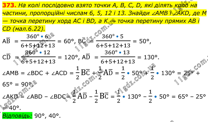 373. На колі послідовно взято точки A, B, C, D, які ділять коло на частини, пропорційні числам 6, 5, 12 і 13. Знайди ∠AMB і ∠AKD, де M — точка перетину хорд AC і BD, а K — точка перетину прямих AB і CD (мал.6.22). AB ̅ = (360° • 6 )/(6+5+12+13) = 60°, BC ̅ = (360° • 5 )/(6+5+12+13) = 50°, CD ̅ = (360° • 12 )/(6+5+12+13) = 120°, AD ̅ = (360° • 13 )/(6+5+12+13) = 130°. ∠AMB = ∠BDC + ∠ACD = 1/2 BC ̅ + 1/2 AD ̅ = 1/2 • 50° + 1/2 • 130° = 25° + 65° = 90°. ∠AKD = ∠ABD – ∠BDC= 1/2 AD ̅ – 1/2 BC ̅ = 1/2 • 130° – 1/2 • 50° = 65° – 25° = 40°. Відповідь: 90°, 40°.