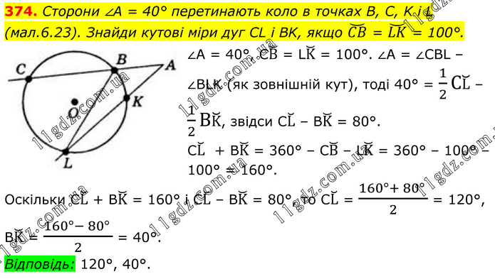 374. Сторони ∠A = 40° перетинають коло в точках B, C, K і L (мал.6.23). Знайди кутові міри дуг CL і BK, якщо (CB) ̆ = (LK) ̆ = 100°. ∠A = 40°, CB ̆ = LK ̆ = 100°. ∠A = ∠CBL – ∠BLK (як зовнішній кут), тоді 40° = 1/2 CL ̆ – 1/2 BK ̆, звідси CL ̆ – BK ̆ = 80°. CL ̆ + BK ̆ = 360° – CB ̆ – LK ̆ = 360° – 100° – 100° = 160°. Оскільки CL ̆ + ВK ̆ = 160° і CL ̆ – BK ̆ = 80°, то CL ̆ = (160°+ 80° )/2 = 120°, ВK ̆ = (160°- 80° )/2 = 40°. Відповідь: 120°, 40°.